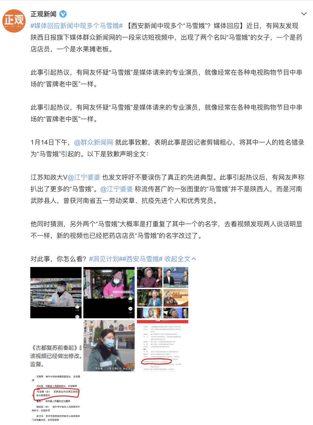 西安新闻中现多个“马雪娥”?媒体回应。据正观新闻,近日,有网友发现陕西日报旗下媒体群众新闻网的一段采访短视频中,出现了两个名叫“马雪娥”的女子,一个是药店店员,一个是水果摊老板。此事引起热议,有网友怀疑“马雪娥”是媒体请来的专业演员,就像经常在各种电视购物节目中串场的“冒牌老中医”一样。1月14日下午,“群众新闻网”就此事致歉,表明此事是因记者剪辑粗心,将其中一人的姓名错录为“马雪娥”引起的。