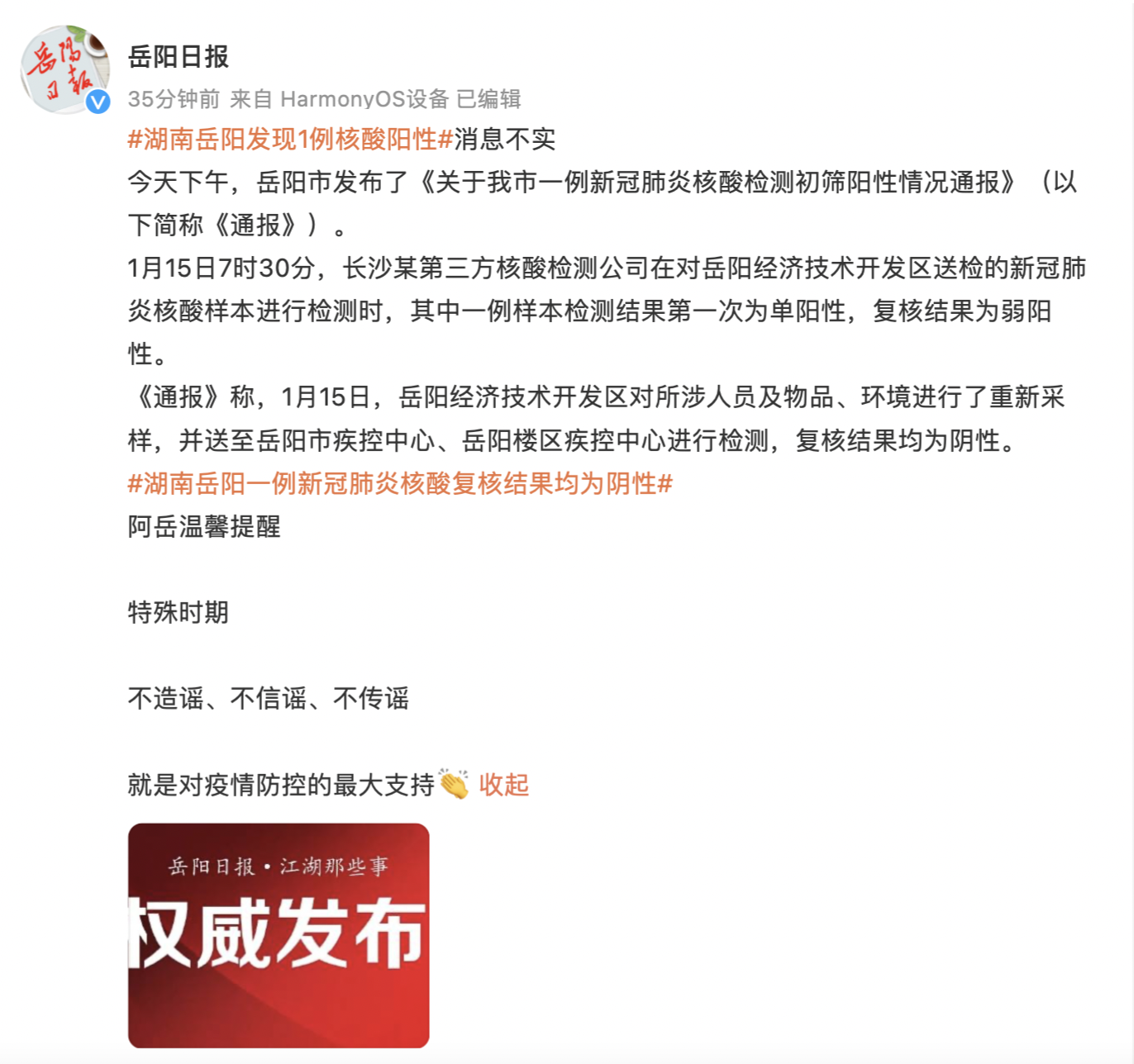 据岳阳日报,1月15日消息,湖南岳阳发现1例核酸阳性消息不实。今天下午,岳阳市发布了《关于我市一例新冠肺炎核酸检测初筛阳性情况通报》(以下简称《通报》)。