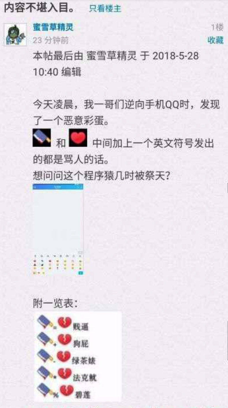 只要在安卓手机QQ上发送“菜刀”表情和“心碎”表情中间加一个特殊的符号,比如加号、等号、减号、百分号等,发送后就会自动生成脏话,而苹果手机QQ则没有出现这种情况。网友称,这是“恶意彩蛋”。手机QQ回应称,这是BUG,安卓版本受影响,不涉及iOS等其他版本。预计今晚完成修复。