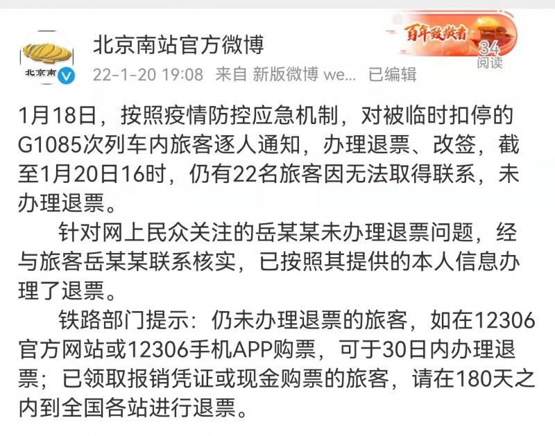 北京朝阳确诊病例岳某某火车票已完成退票。据北京日报,1月20日晚,北京南站官方微博通报:1月18日,按照疫情防控应急机制,对被临时扣停的G1085次列车内旅客逐人通知,办理退票、改签,截至1月20日16时,仍有22名旅客因无法取得联系,未办理退票。针对网上民众关注的岳某某未办理退票问题,经与旅客岳某某联系核实,已按照其提供的本人信息办理了退票。