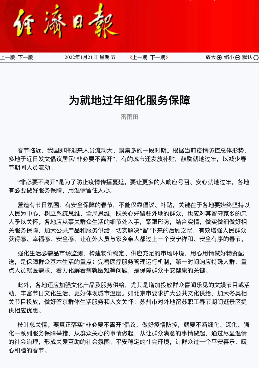 经济日报:为就地过年细化服务保障。春节临近,我国即将迎来人员流动大、聚集多的一段时期。根据当前疫情防控总体形势,多地于近日发文倡议居民“非必要不离开”,有的城市还发放补贴,鼓励就地过年,以减少春节期间人员流动。“非必要不离开”是为了防止疫情传播蔓延。要让更多的人响应号召、安心就地过年,各地有必要做好服务保障,用温情留住人心。