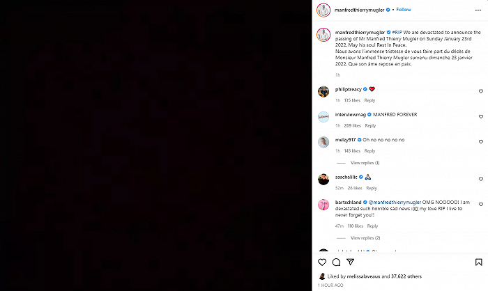 据界面新闻,法国知名时装设计师Thierry Mugler的官方Instagram账号24日发布声明称:“我们非常悲痛地宣布Manfred Thierry Mugler先生于2022年1月23日去世。愿他的灵魂得到安息。”