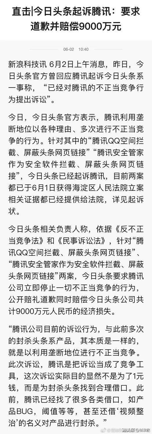 一直没想清楚头条为什么以20分之一的体量蚂蚁撼树,会不会像淘宝那样被从微信体系彻底封杀,从而被重创?假设理由一,抖音被封杀没有带来实质性伤害,所以宁愿撕出名声带来更多原本观望的竞争对手用户;二,如果微信进一步封杀头条,会激起更多愤慨和同仇敌忾的同盟一起反抗微信,从而有机会势均力敌地谈判;三,让更多的自媒体等等腾讯合作伙伴感觉到深深的不安全感和死亡恐惧,从而哪怕不逃离微信也会下决心在头条用力推广从而脚踩两只船自保;假设理由四,阿里已经注资支持头条对抗腾讯…无论是哪个原因,腾讯诉1元,头条诉9000万,大家看出点儿什么?