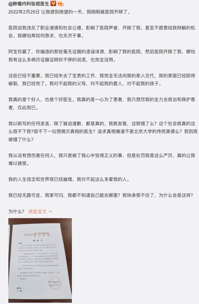 2月25日,“揭黑医生”张煜在其个人微博发消息称,其被此前所供职的医院,北京大学第三医院开除,并晒出了医院发布的通知书。通知还表示,即日起,张煜不得以北京大学第三医院职工的身份进行宣传或从事医疗、学术等相关活动。