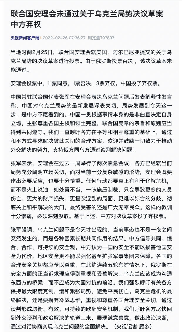 联合国安理会未通过关于乌克兰局势决议草案,中方发表解释性发言。