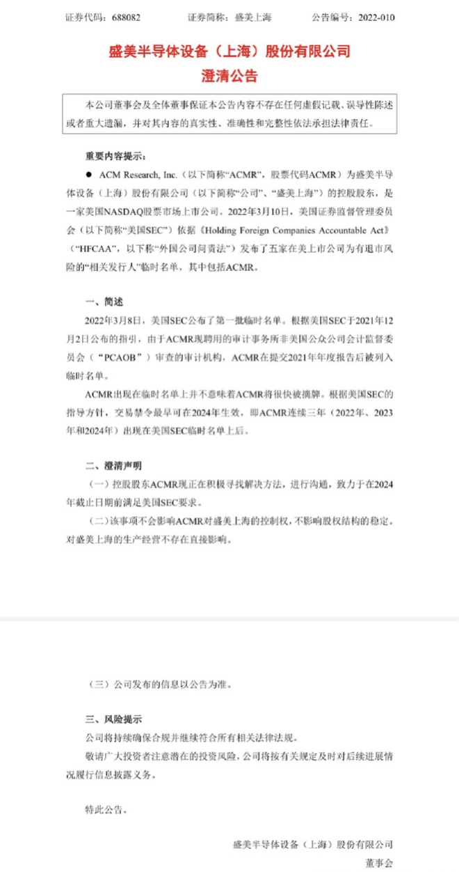 盛美上海:控股股东ACMR正在积极寻找解决方法,致力于满足美国SEC要求。盛美上海早间公告,3月8日,美国SEC公布了第一批临时名单。根据美国SEC于2021年12月2日公布的指引,由于控股股东ACMR现聘用的审计事务所非美国公众公司会计监督委员会(“PCAOB”)审查的审计机构,ACMR在提交2021年年度报告后被列入临时名单。ACMR出现在临时名单上并不意味着ACMR将很快被摘牌。控股股东ACMR现正在积极寻找解决方法,进行沟通,致力于在2024年截止日期前满足美国SEC要求。