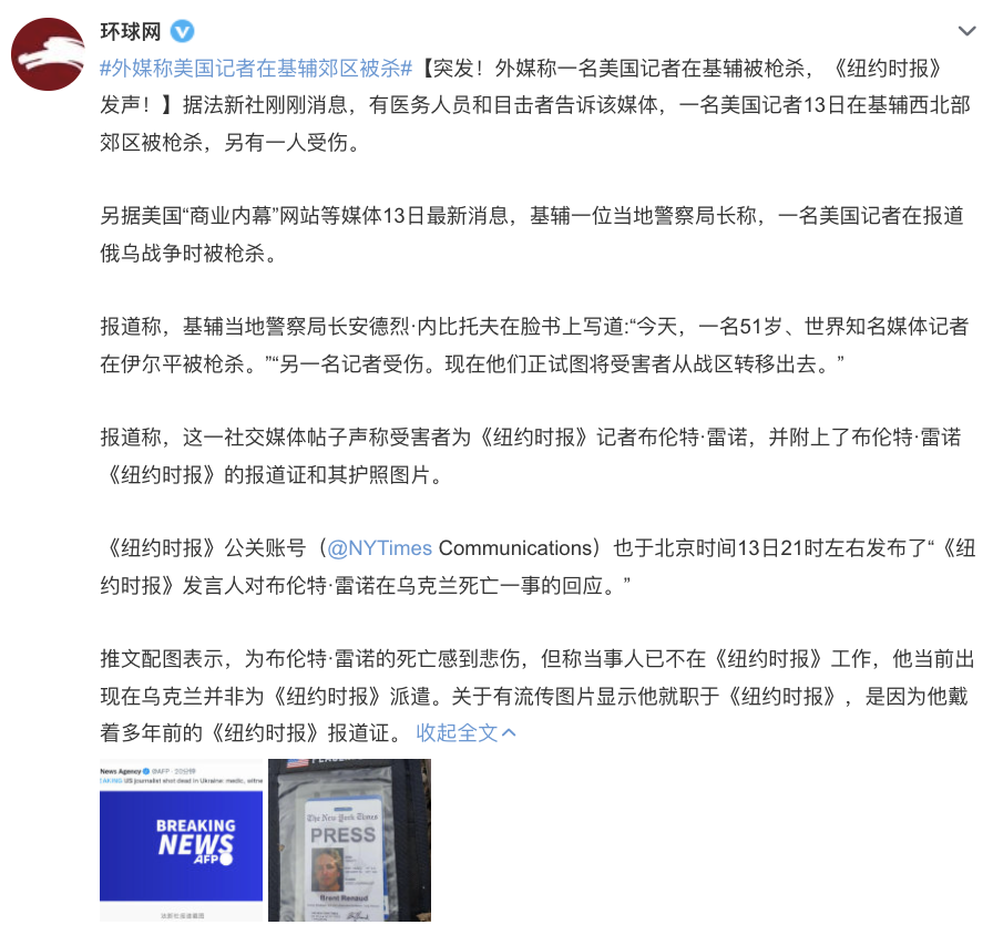 外媒称美国记者在基辅郊区被杀,《纽约时报》回应。