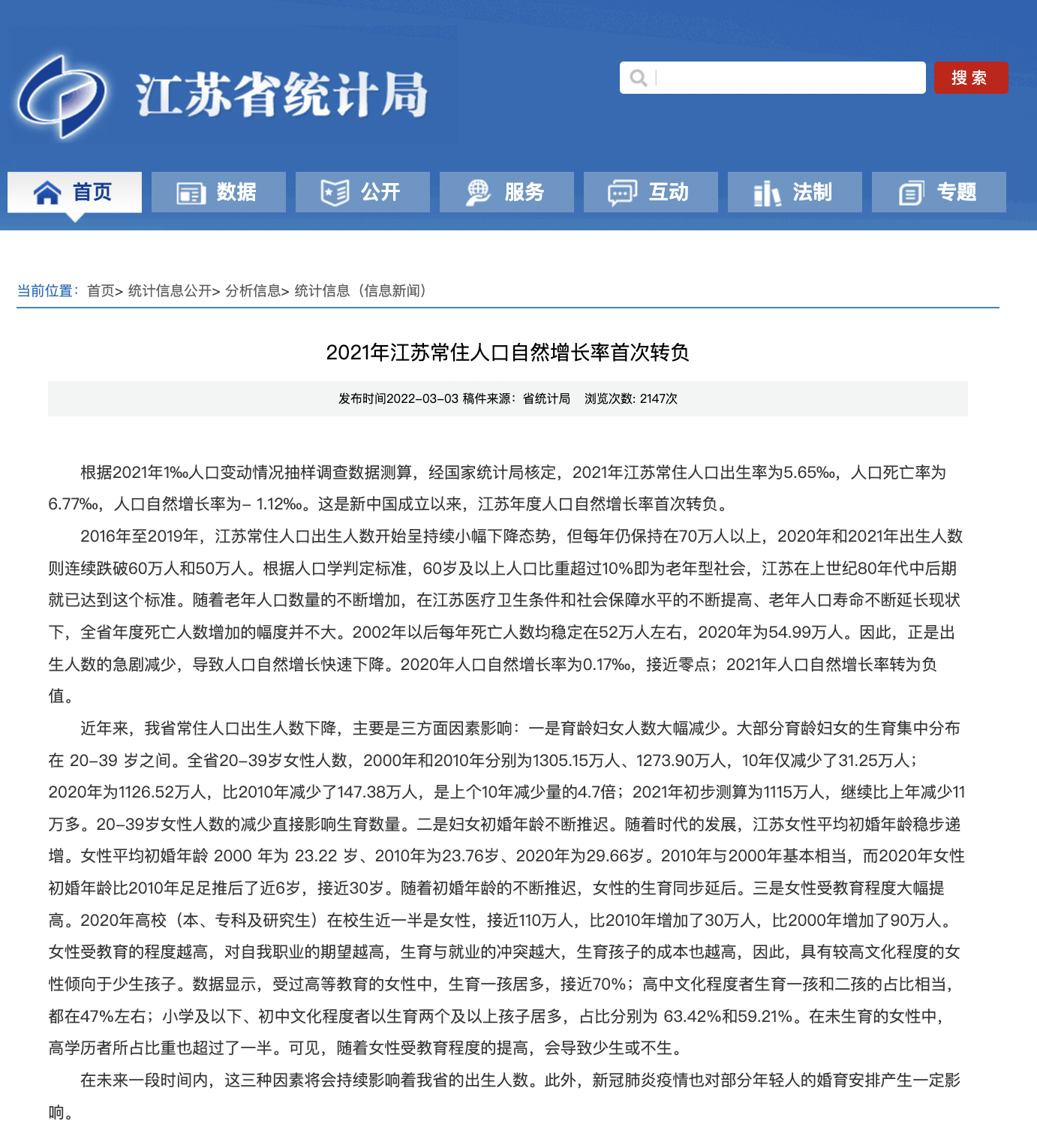 据第一财经,近日江苏省统计局网站发布《2021年江苏常住人口自然增长率首次转负》。报告分析指出,江苏省常住人口出生人数下降,主要是三方面因素影响:一是育龄妇女人数大幅减少。二是妇女初婚年龄不断推迟。三是女性受教育程度大幅提高。女性受教育程度越高,对自我职业的期望越高,生育与就业的冲突越大,生育孩子的成本也越高,因此,具有较高文化程度的女性倾向于少生孩子。