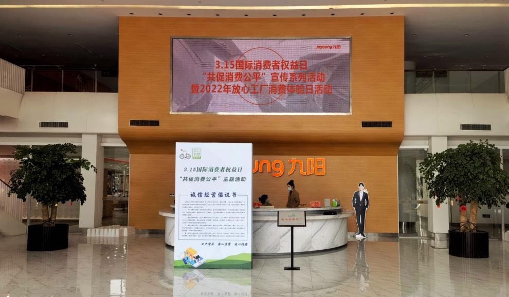 浙江钱塘3·15消费者体验活动走进九阳放心工厂。近日,由钱塘区市场监督管理局和钱塘区消费者协会主办的主题为“共促消费公平”的3·15消费者体验活动,来到浙江钱塘九阳工业园区,一系列高科技、高品质小家电吸引消费者争相体验。九阳法律事务中心总经理周纪军表示,九阳作为放心消费工厂代表,有责任有义务促进消费公平,提振消费信心。活动最后,周纪军代表九阳发起倡议,号召广大同仁诚信经营,切实维护消费者合法权益,为营造安全放心的消费环境做出更大努力。