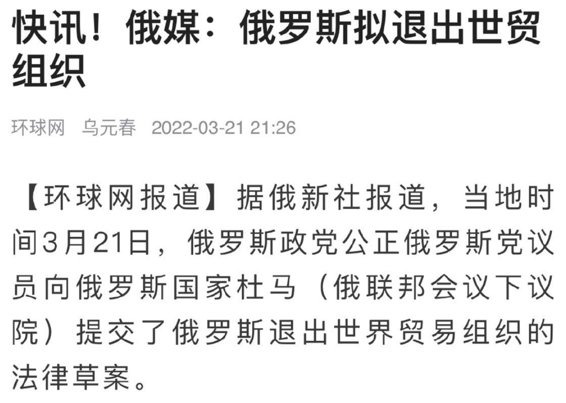 据环球网援引俄新社报道,当地时间3月21日,俄罗斯政党公正俄罗斯党议员向俄罗斯国家杜马(俄联邦会议下议院)提交了俄罗斯退出世界贸易组织的法律草案。