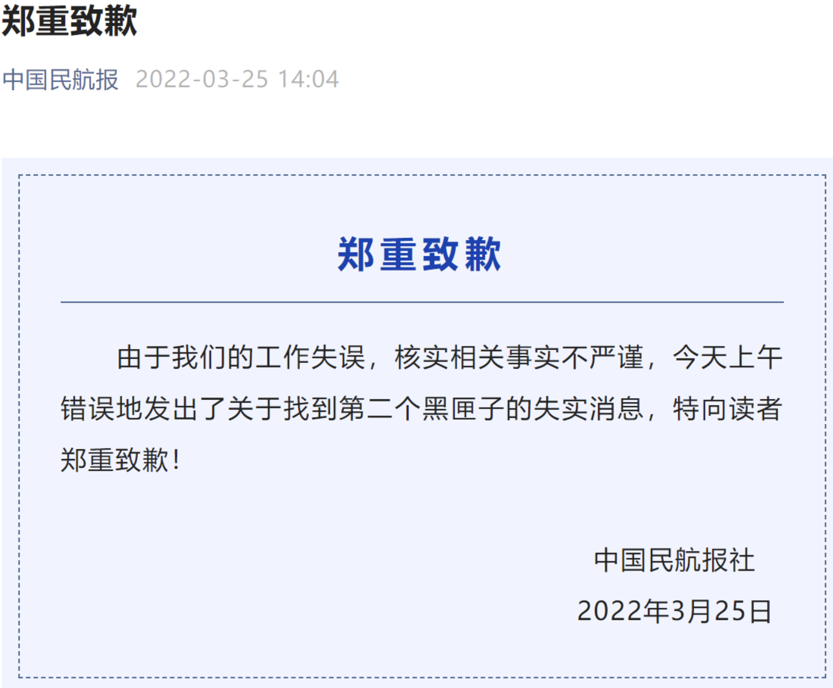 中国民航报发布致歉声明:由于我们的工作失误,核实相关事实不严谨,今天上午错误地发出了关于找到第二个黑匣子的失实消息,特向读者郑重致歉!