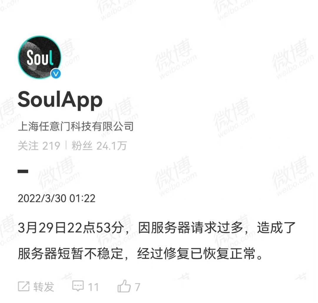 Soul回应App崩了。据环球TECH,昨日深夜十一点左右,陆续有用户反馈称社交平台Soul崩了,不仅服务端异常,群聊也出现问题。对此,Soul官方回应称,因服务器请求过多,造成了服务器短暂不稳定,经过修复已恢复正常。