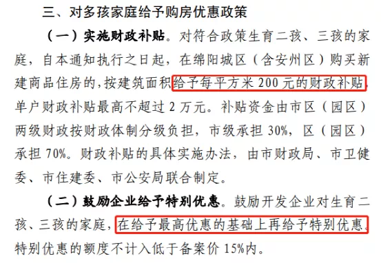 据中国基金报,各地因城施策促进房地产市场平稳健康发展的措施越来越多,近日“四川第二城”绵阳放了个大招,除了常规的放宽公积金购房使用条件、提高预售资金使用效率等,对二孩三孩家庭购房直接给补贴:购买新建商品住房的,按建筑面积给予每平方米200元的财政补贴。