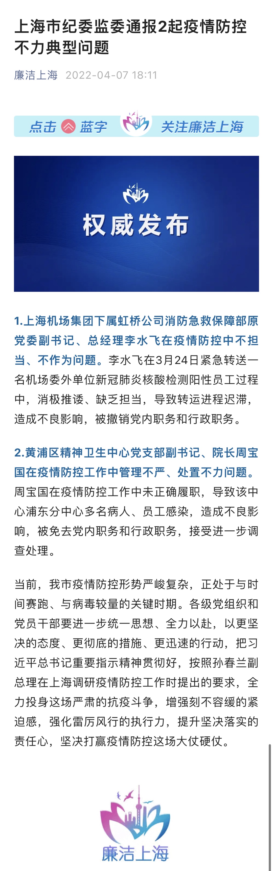 1.上海机场集团下属虹桥公司消防急救保障部原党委副书记、总经理李水飞在疫情防控中不担当、不作为问题。李水飞在3月24日紧急转送一名机场委外单位新冠肺炎核酸检测阳性员工过程中,消极推诿、缺乏担当,导致转运进程迟滞,造成不良影响,被撤销党内职务和行政职务。