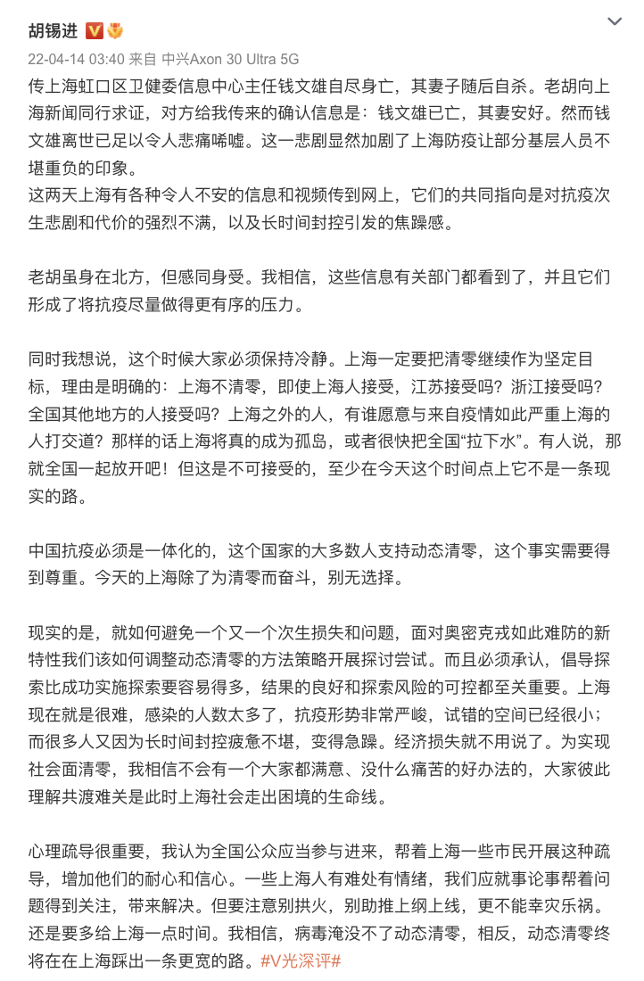 老胡向上海新闻同行求证,对方给我传来的确认信息是:钱文雄已亡,其妻安好。然而钱文雄离世已足以令人悲痛唏嘘。这一悲剧显然加剧了上海防疫让部分基层人员不堪重负的印象。