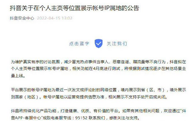 抖音拟在个人主页等位置展示帐号IP属地,4月底开启测试。据北京商报,抖音安全中心4月15日宣布,为维护真实有序的讨论氛围,减少冒充热点事件当事人、恶意造谣、蹭流量等不良行为,抖音拟在个人主页等位置展示帐号IP属地,相关功能在4月底进行测试,将根据测试情况逐步在其他场景全量上线。平台展示的帐号IP属地为最近一次发文或评论时的网络位置,境内展示到省(区、市),境外展示到国家(地区)。帐号IP属地以运营商提供信息为准,相关展示不支持手动开启或关闭。