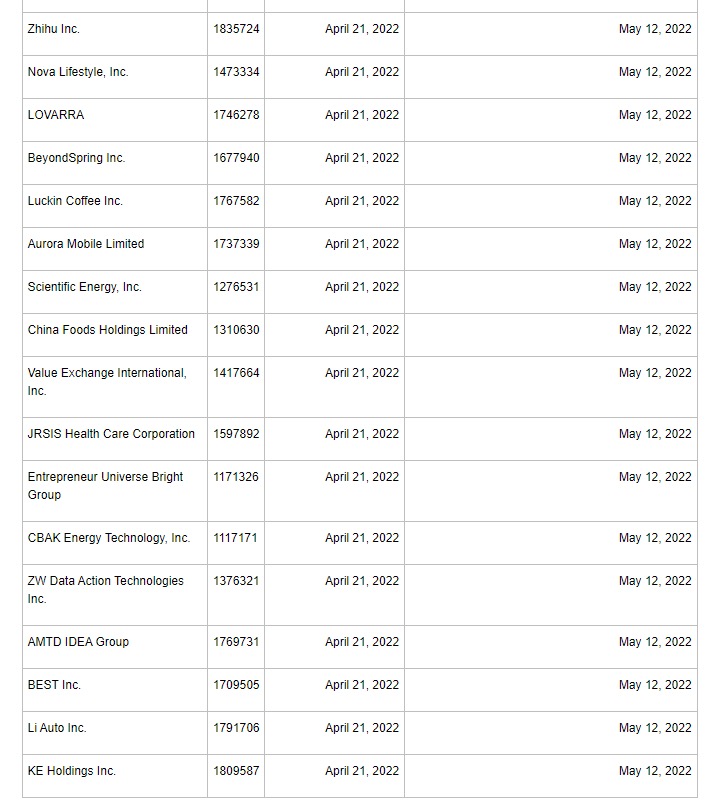 具体名单为:知乎、诺华家具、LOVARRA、万春医药、瑞幸咖啡、极光、Scientific Energy、中国食品、Value Exchange International、泽尔西西医疗集团、Entrepreneur Universe Bright Group、中比能源、中网载线、尚乘国际、百世集团、理想汽车和贝壳。SEC声称,上述17家公司提交申辩的截止时间为当地时间5月12日。