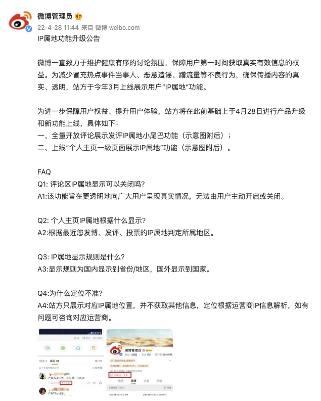 新浪微博宣布全量开放展示用户“IP属地”功能。4月28日,新浪微博社区管理官方微博发布IP属地功能升级公告:站方于今年3月上线展示用户“IP属地”功能。为进一步保障用户权益、提升用户体验,站方将在此前基础上于4月28日进行产品升级和新功能上线。具体如下:全量开放评论展示发评IP属地小尾巴功能;上线“个人主页一级页面展示IP属地”功能。你支持全量开放展示用户IP属地的功能吗?