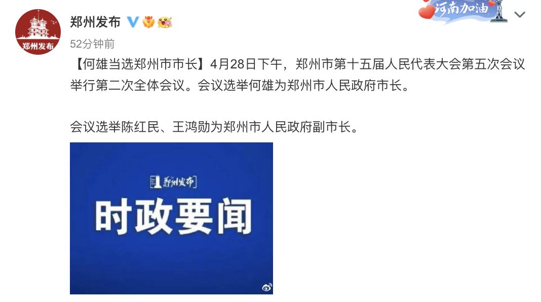 何雄当选郑州市市长。