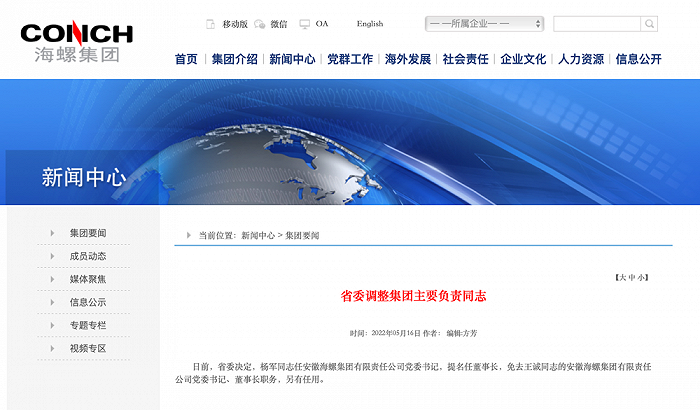 杨军任安徽海螺集团有限责任公司党委书记,提名任董事长。据海螺集团官网消息,日前,安徽省委决定,杨军任安徽海螺集团有限责任公司党委书记,提名任董事长,免去王诚的安徽海螺集团有限责任公司党委书记、董事长职务,另有任用。