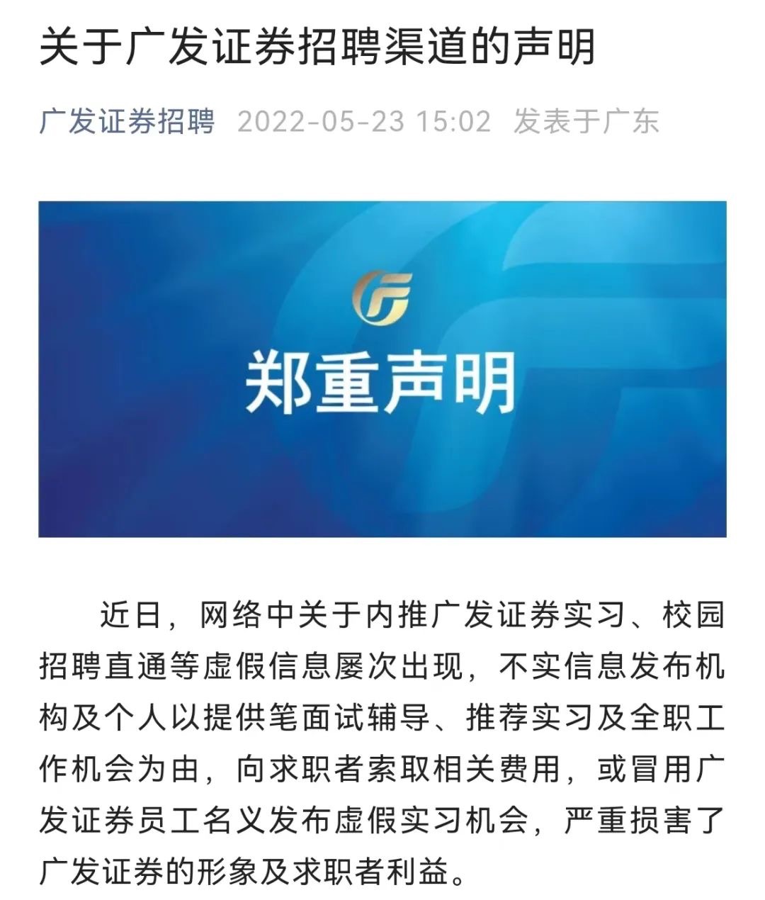 广发证券发布声明称,从未授权任何机构或个人代表广发证券进行面试辅导或提供实习及工作机会,更不存在“保过”等捷径。