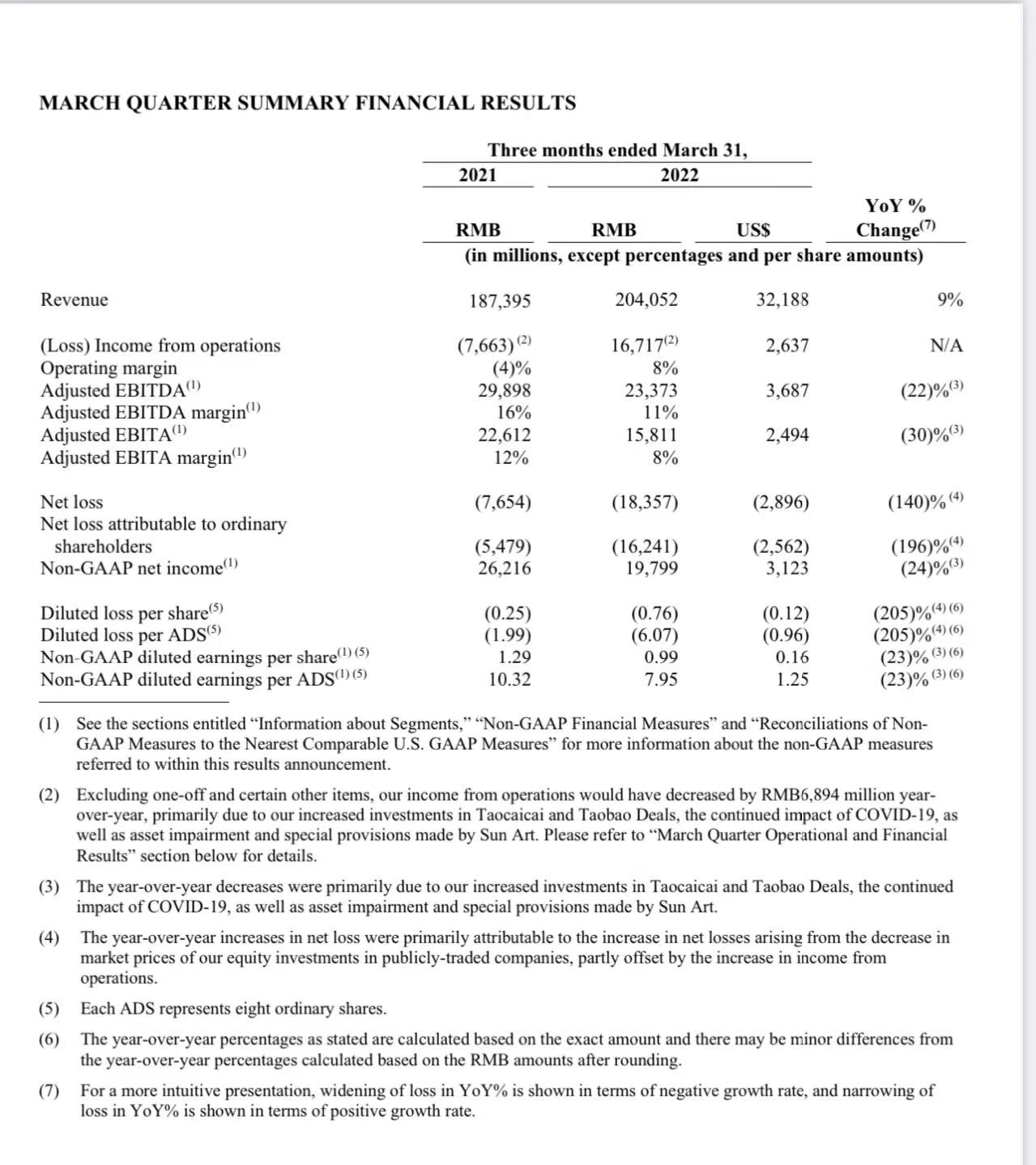 阿里巴巴2022年第四财季(截至2022年3月31日止的3个月)营收2,040.5亿元,同比增长8.9%,预估2,005.9亿元;第四财季调整后每ADS收益7.95元,预估7.10元。调整后净利润198.0亿元人民币,同比下降24%。调整后息税折旧及摊销前利润233.7亿元,同比下降22%,预估220.3亿元。云业务收入189.7亿元,同比增长13%,预估204亿元。