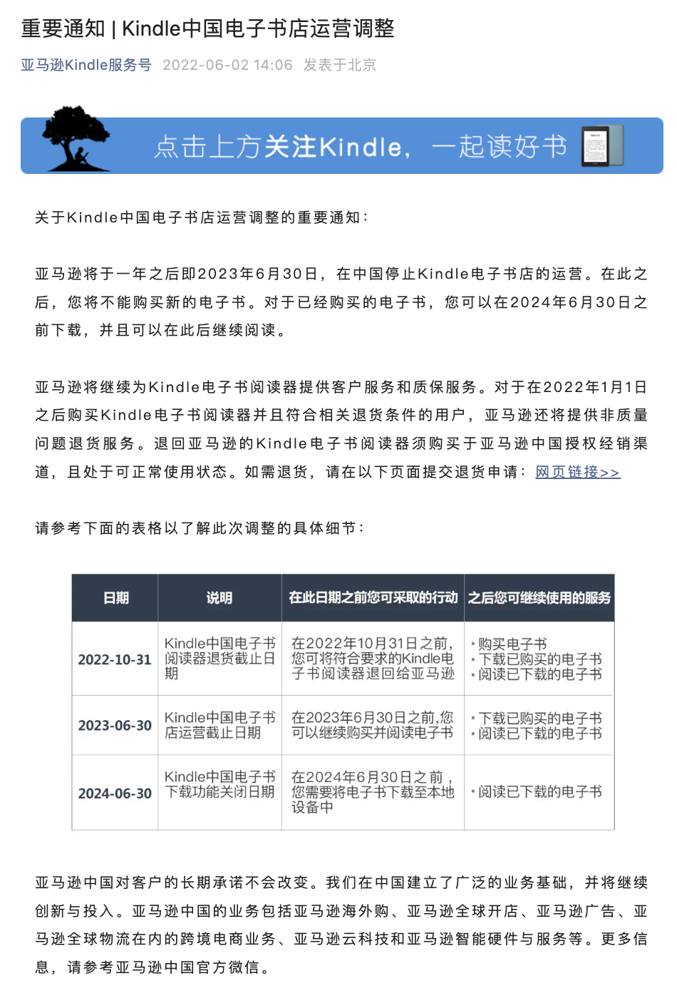 亚马逊Kindle服务号发布通知称,亚马逊将于一年之后即2023年6月30日,在中国停止Kindle电子书店的运营。