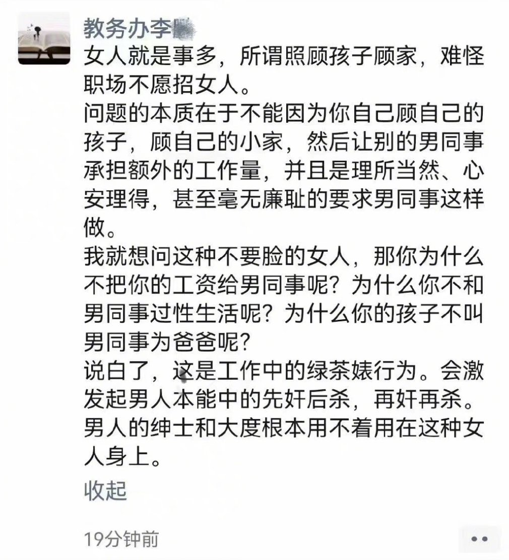 高校回应教师在朋友圈发歧视女性言论:解除聘用关系。据中国新闻周刊,近日,网传宁波大学教师教育学院一教师在朋友圈发文批评“工作中的绿茶行为”,对职场中女同事因顾孩子等原因让男同事承担额外工作量表达不满,声称“女人就是事多”,其中不乏激烈用词。对此,“宁波大学教师教育学院官微”6日回应称,经调查,我院李某在微信朋友圈发布不当言论,产生严重不良影响。学校研究决定,即日起解除其聘用关系。