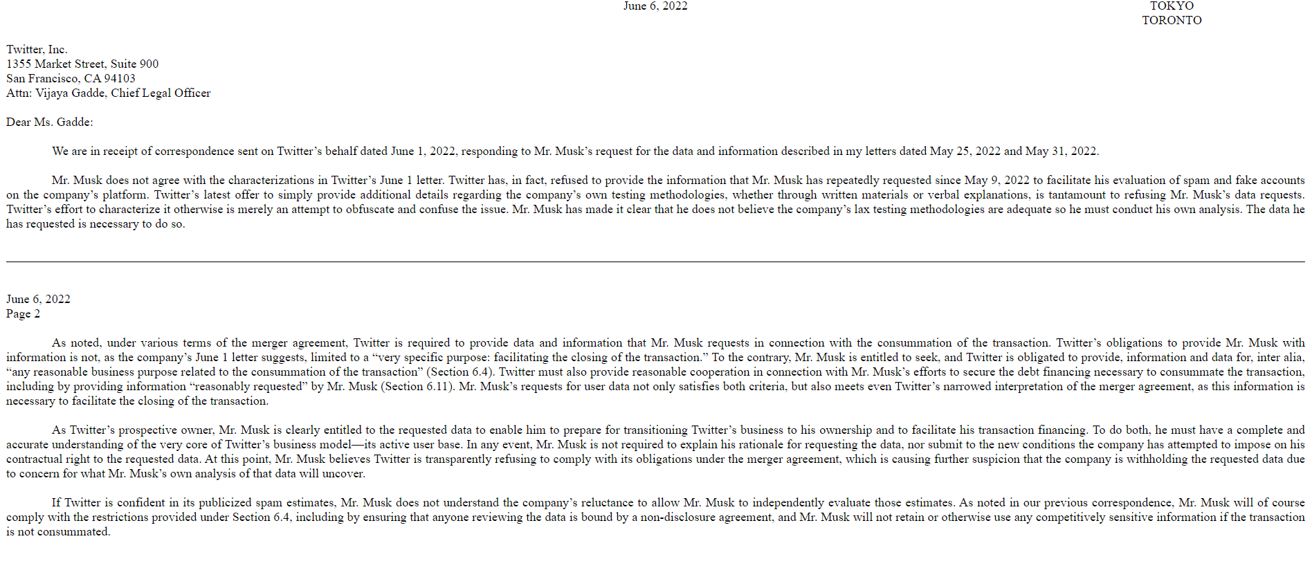 在信件的最后一段,Ringler放出狠话,强调基于推特公司至今的一系列作为,特别是最近的回信,都是在抵制和阻挠马斯克的知情权。此举清晰、实质地违背了推特公司在并购协议下的义务,因此马斯克保留不完成交易或中止收购协议的权利。
