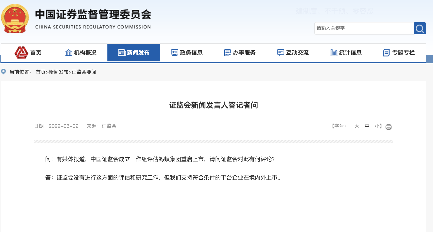 证监会:没有进行蚂蚁集团重启上市的评估和研究工作。问:有媒体报道,中国证监会成立工作组评估蚂蚁集团重启上市,请问证监会对此有何评论?答:证监会没有进行这方面的评估和研究工作,但我们支持符合条件的平台企业在境内外上市。