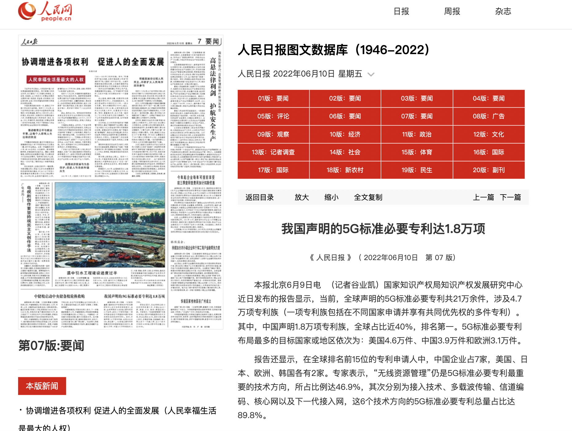 排名第一!中国声明的5G标准必要专利达1.8万项。当前,全球声明的5G标准必要专利共21万余件,涉及4.7万项专利族(一项专利族包括在不同国家申请并享有共同优先权的多件专利)。其中,中国声明1.8万项专利族,中国声明的5G标准必要专利族占全球近40%,排名第一。5G标准必要专利布局最多的目标国家或地区依次为:美国4.6万件、中国3.9万件和欧洲3.1万件。报告还显示,在全球排名前15位的专利申请人中,中国企业占7家,美国、日本、欧洲、韩国各有2家。