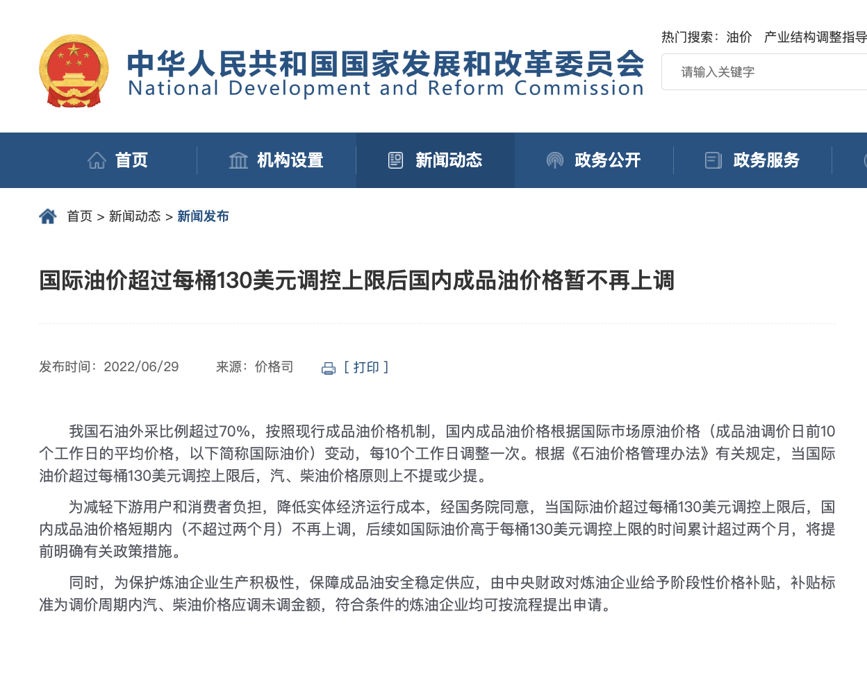 发改委:国际油价超过每桶130美元调控上限后国内成品油价格暂不再上调。为减轻下游用户和消费者负担,降低实体经济运行成本,经国务院同意,当国际油价超过每桶130美元调控上限后,国内成品油价格短期内(不超过两个月)不再上调,后续如国际油价高于每桶130美元调控上限的时间累计超过两个月,将提前明确有关政策措施。同时,为保护炼油企业生产积极性,保障成品油安全稳定供应,由中央财政对炼油企业给予阶段性价格补贴,补贴标准为调价周期内汽、柴油价格应调未调金额,符合条件的炼油企业均可按流程提出申请。