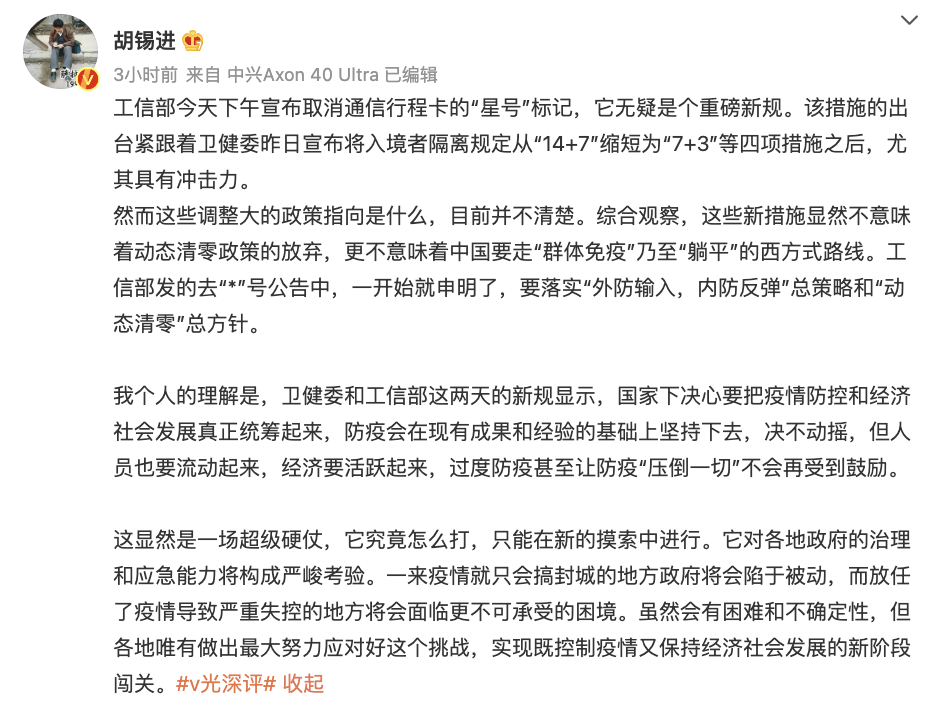 综合观察,这些新措施显然不意味着动态清零政策的放弃,更不意味着中国要走“群体免疫”乃至“躺平”的西方式路线。工信部发的去“*”号公告中,一开始就申明了,要落实“外防输入,内防反弹”总策略和“动态清零”总方针。