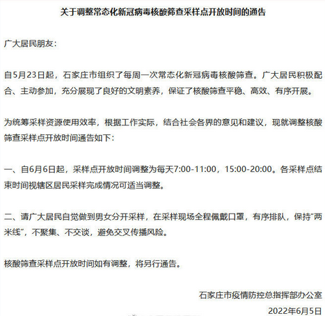 据“石家庄发布”微信公众号7月3日消息,为及时排查疫情潜在风险,自5月23日起,石家庄市开展了每周一次的常态化新冠病毒核酸筛查。广大居民积极配合、主动参与,保障了核酸筛查平稳、高效、有序开展。根据《新型冠状病毒肺炎防控方案(第九版)》要求和省疫情防控有关规定,鉴于我市目前疫情防控形势,市疫情防控总指挥部研究决定,对常态化新冠病毒核酸筛查工作进行调整,现就有关事宜通告如下: