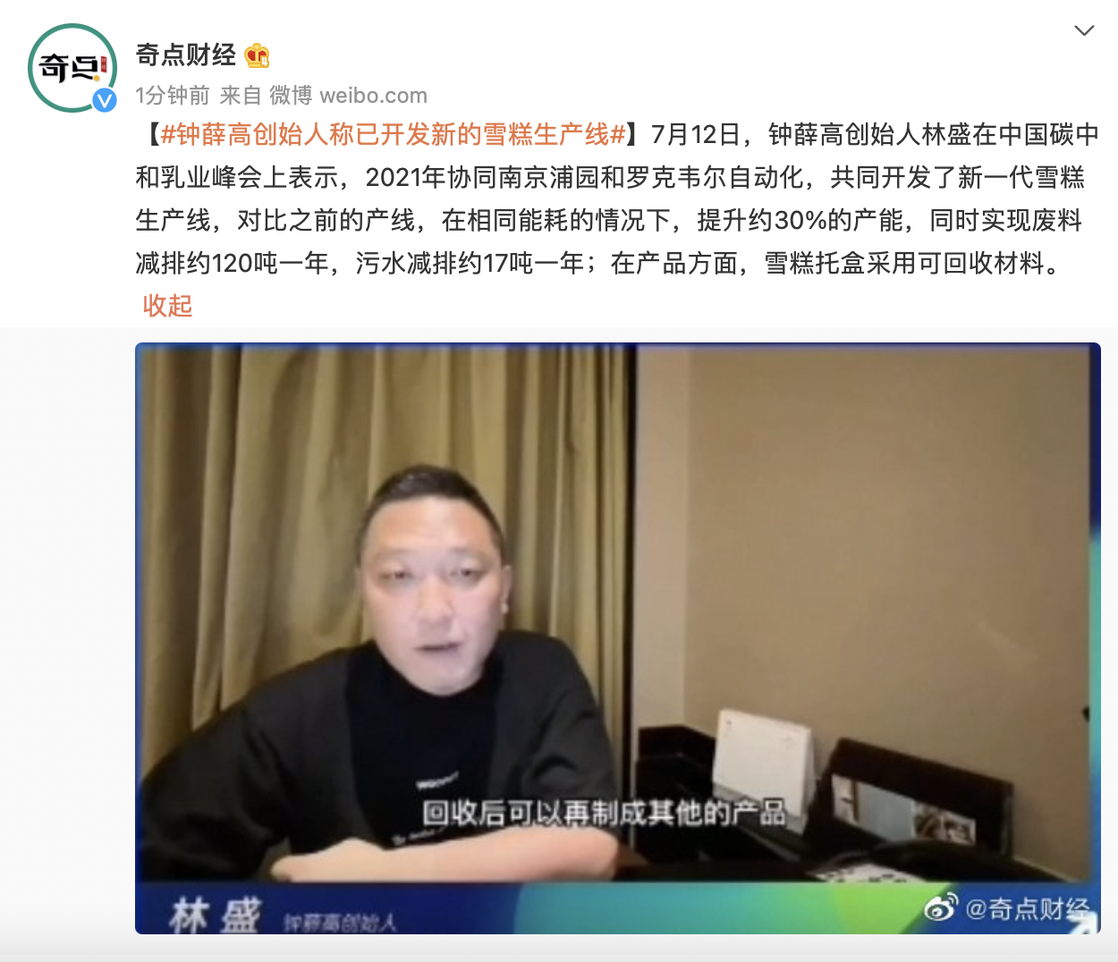 钟薛高创始人称已开发新的雪糕生产线。据奇点财经,7月12日,钟薛高创始人林盛在中国碳中和乳业峰会上表示,2021年协同南京浦园和罗克韦尔自动化,共同开发了新一代雪糕生产线,对比之前的产线,在相同能耗的情况下,提升约30%的产能,同时实现废料减排约120吨一年,污水减排约17吨一年;在产品方面,雪糕托盒采用可回收材料。