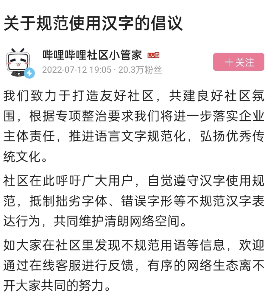 B站、微博现已先后发布公告,呼吁用户规范使用汉字。B站昨日晚间发布倡议称,根据专项整治要求将进一步落实企业主体责任,推进语言文字规范化,弘扬优秀传统文化。B站呼吁广大用户,自觉遵守汉字使用规范,抵制拙劣字体、错误字形等不规范汉字表达行为,共同维护清朗网络空间。7月13日,“微博管理员”发文称,为营造清朗的网络空间,维护文明健康的社区生态秩序,站方将对站内利用谐音字、变体字等“错别字”发布、传播不良信息的违规行为开展集中整治。