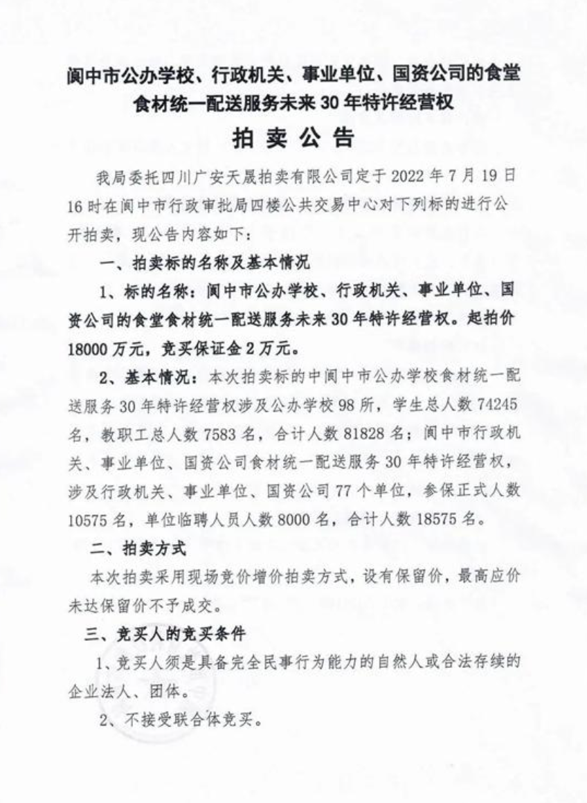 近日,四川南充市公共资源交易网阆中分网发布了一则拍卖公告,引发网友热议。引发质疑的拍卖标的物为:阆中市公办学校、行政机关、事业单位、国资公司的食堂食材统一配送服务未来30年特许经营权。民以食为天,食以安为先。98所学校、77个单位、10万余职工和学生、30年的食堂食材配送经营权,涉及群体之多、时间跨度之长、利益牵扯之深,无不让人对此次拍卖忧心忡忡。
