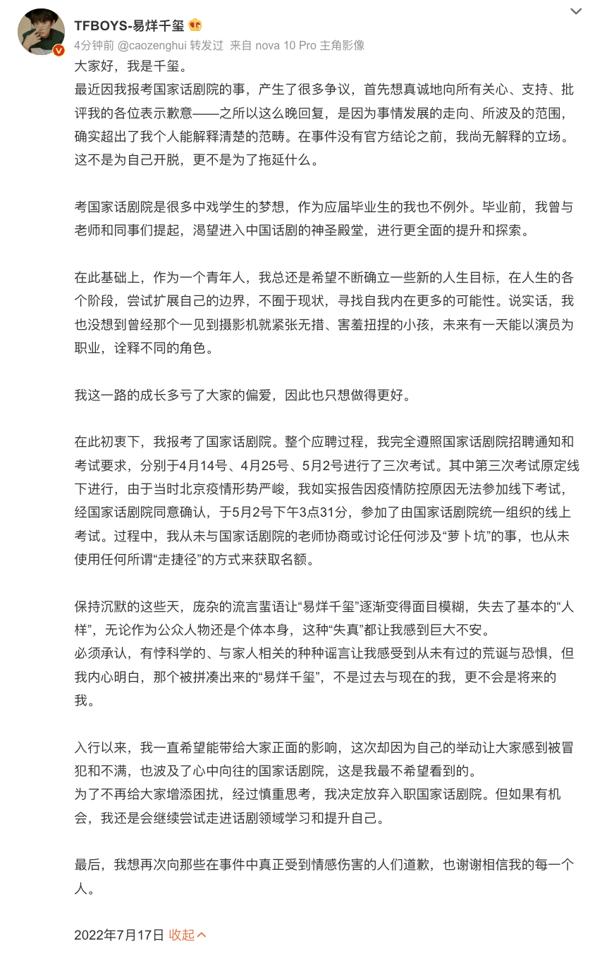 易烊千玺:放弃⼊职国家话剧院。据北京日报,7月17日,易烊千玺在微博发布长文,回应“考编”质疑,并表示自己决定放弃入职国家话剧院。易烊千玺表示,经国家话剧院同意确认,于5月2号下午3点31分,参加了由国家话剧院统一组织的线上考试,“经过慎重思考,我决定放弃入职国家话剧院。但如果有机会,我还是会继续尝试走进话剧领域学习和提升自己。”