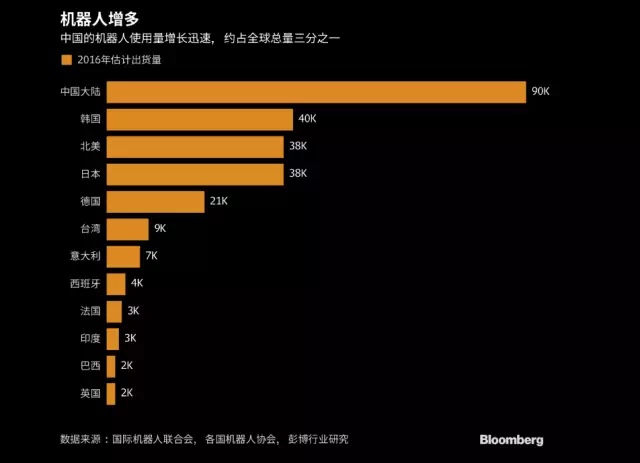 据国际机器人联合会估算,中国在去年的机器人出货量窜升27%,创出9万台左右的单一国家纪录新高,接近全球总量的三分之一,2019年将接近翻一番到16万台。彭博援引此数据称,中国正在安装的机器人比其他任何国家都多,这可能会影响到其他所有国家。自动化会增加国内的收入不平衡,不利于消费。“自动化对供给的推动和对需求的打压,可能加剧中国对出口导向型增长的依赖——从而威胁到国内和国际经济更加平衡的希望。”