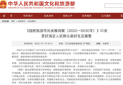 据红星新闻,近日,国家发展改革委、文化和旅游部近日联合印发《国民旅游休闲发展纲要(2022—2030年)》(下称《纲要》),旨在进一步优化我国旅游休闲环境,完善相关公共服务体系,提升产品和服务质量,丰富旅游休闲内涵,促进相关业态融合。据悉,《纲要》共提出10项重点任务,具体包括发展现代休闲业态、提升旅游休闲体验、推进产品创新升级等内容。其中,关于保障旅游休闲时间、优化全国年节和法定节假日时间分布格局的内容,引发社会热议。