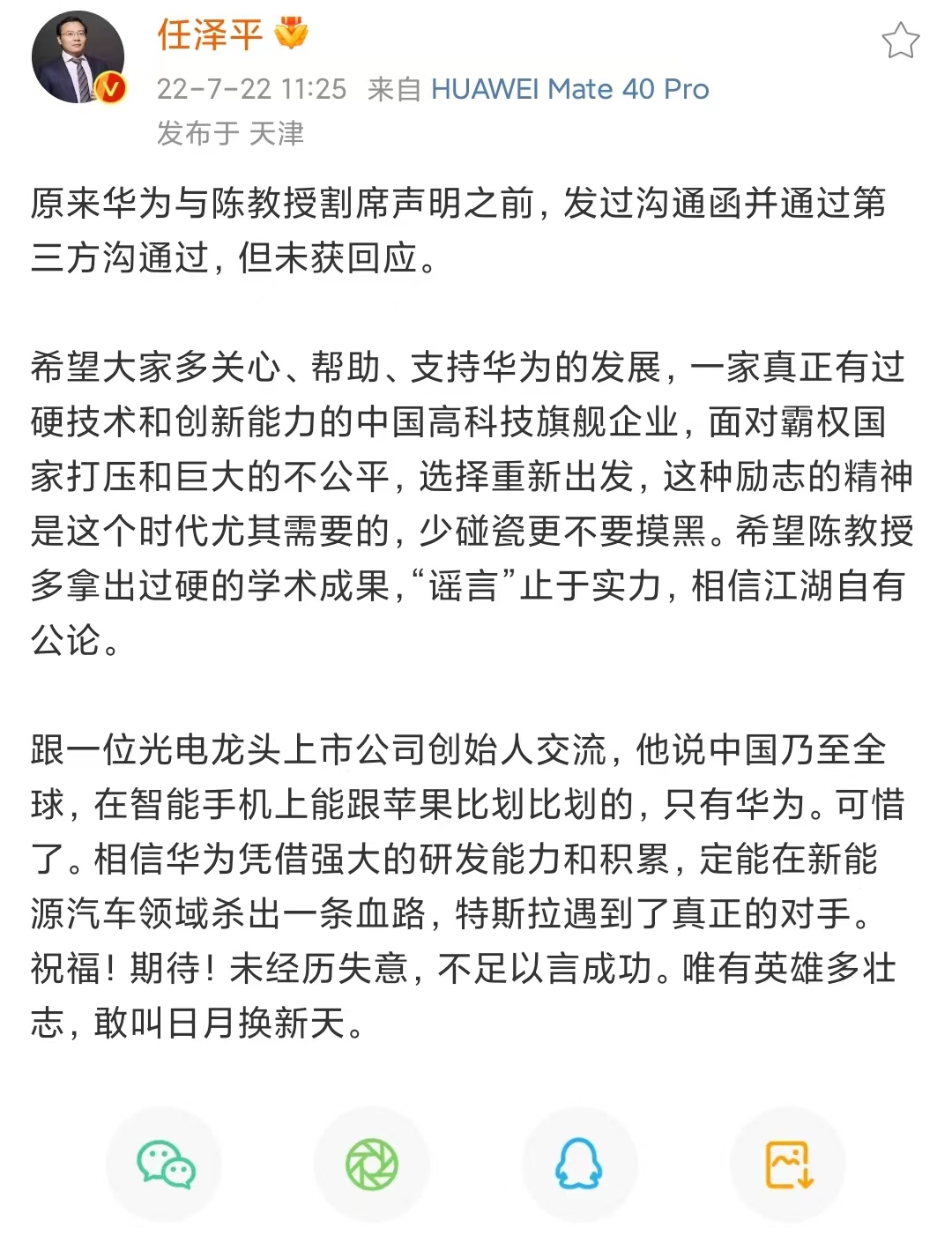任泽平爆料:华为与陈春花割席声明前沟通过。据奇点财经,7月22日,任泽平在社交平台上发文,原来华为与陈教授割席声明之前,发过沟通函并通过第三方沟通过,但未获回应。希望大家多关心、帮助、支持华为的发展,一家真正有过硬技术和创新能力的中国高科技旗舰企业,面对霸权国家打压和巨大的不公平,选择重新出发,这种励志的精神是这个时代尤其需要的,少碰瓷更不要摸黑。希望陈教授多拿出过硬的学术成果,“谣言”止于实力,相信江湖自有公论。