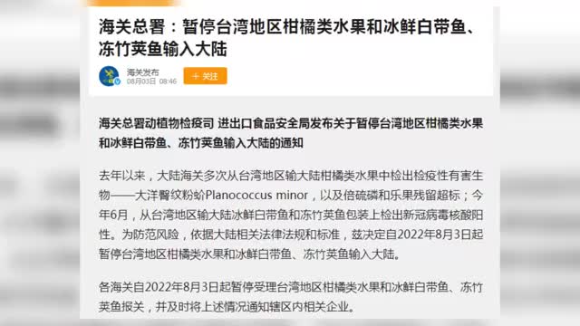 海关总署:8月3日起暂停台湾地区柑橘类水果和冰鲜白带鱼、冻竹荚鱼输入大陆。8月3日,海关总署公告,去年以来,大陆海关多次从台湾地区输大陆柑橘类水果中检出检疫性有害生物——大洋臀纹粉蚧Planococcus minor,以及倍硫磷和乐果残留超标;今年6月,从台湾地区输大陆冰鲜白带鱼和冻竹荚鱼包装上检出新冠病毒核酸阳性。为防范风险,依据大陆相关法律法规和标准,兹决定自2022年8月3日起暂停台湾地区柑橘类水果和冰鲜白带鱼、冻竹荚鱼输入大陆。(via 燃新闻)