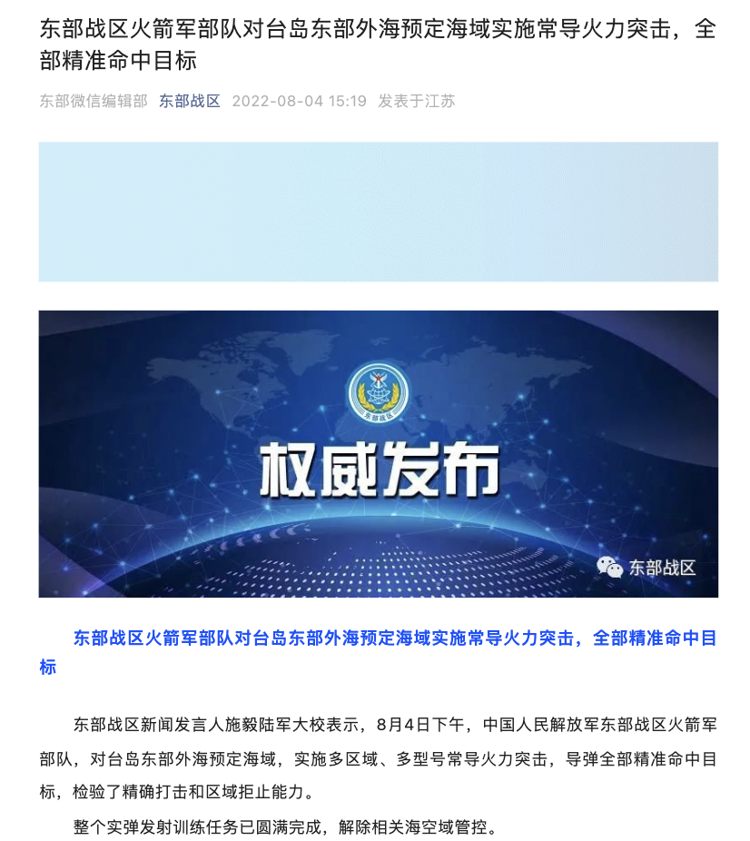 东部战区火箭军部队对台岛东部外海预定海域实施常导火力突击,全部精准命中目标。东部战区新闻发言人施毅陆军大校表示,8月4日下午,中国人民解放军东部战区火箭军部队,对台岛东部外海预定海域,实施多区域、多型号常导火力突击,导弹全部精准命中目标,检验了精确打击和区域拒止能力。整个实弹发射训练任务已圆满完成,解除相关海空域管控。