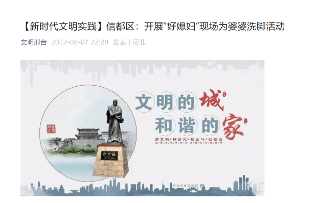 8月9日,河北邢台一社区举办的“给婆婆洗脚”活动引发关注。8月7日,“文明邢台”公众号上刊登了一则题为“开展‘好媳妇’现场为婆婆洗脚活动”的文章。文章提到,2022年8月7日上午,信都区一社区开展了“好媳妇”现场为婆婆洗脚活动,传播文明新风尚,倡树新风家风家教实践活动。