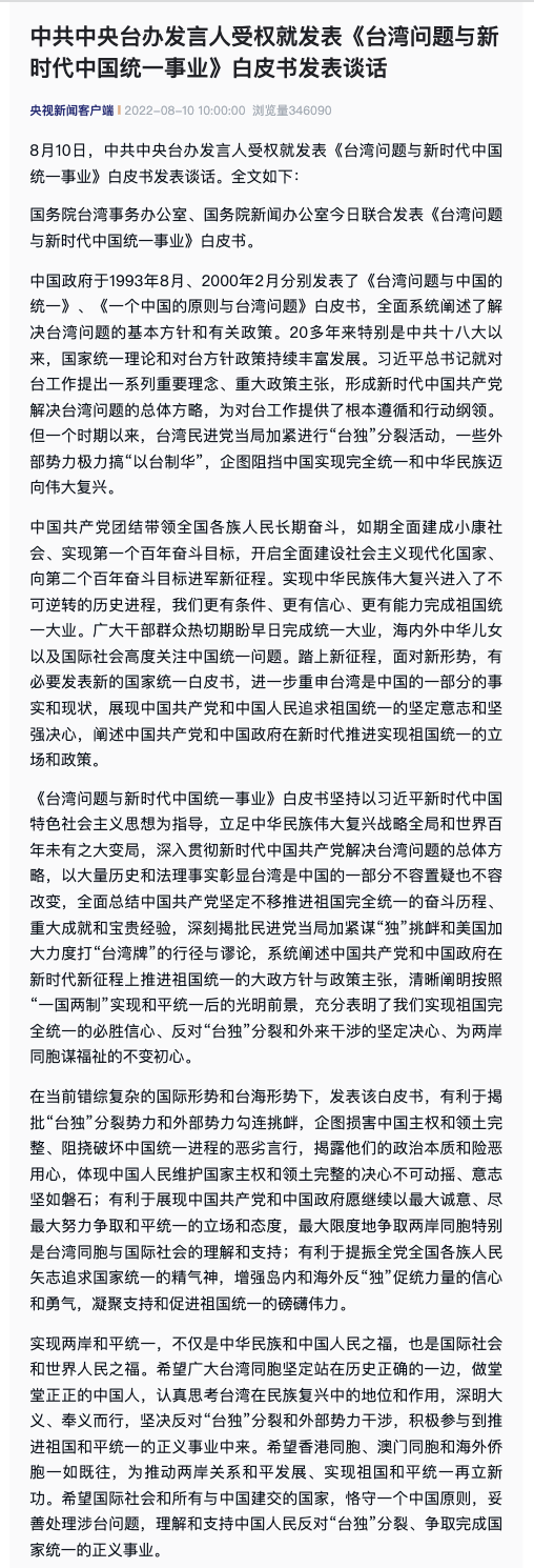 中共中央台办发言人受权就发表《台湾问题与新时代中国统一事业》白皮书发表谈话。据央视新闻,8月10日,中共中央台办发言人受权就发表《台湾问题与新时代中国统一事业》白皮书发表谈话。实现两岸和平统一,不仅是中华民族和中国人民之福,也是国际社会和世界人民之福。希望广大台湾同胞坚定站在历史正确的一边,做堂堂正正的中国人,认真思考台湾在民族复兴中的地位和作用,深明大义、奉义而行,坚决反对“台独”分裂和外部势力干涉,积极参与到推进祖国和平统一的正义事业中来。