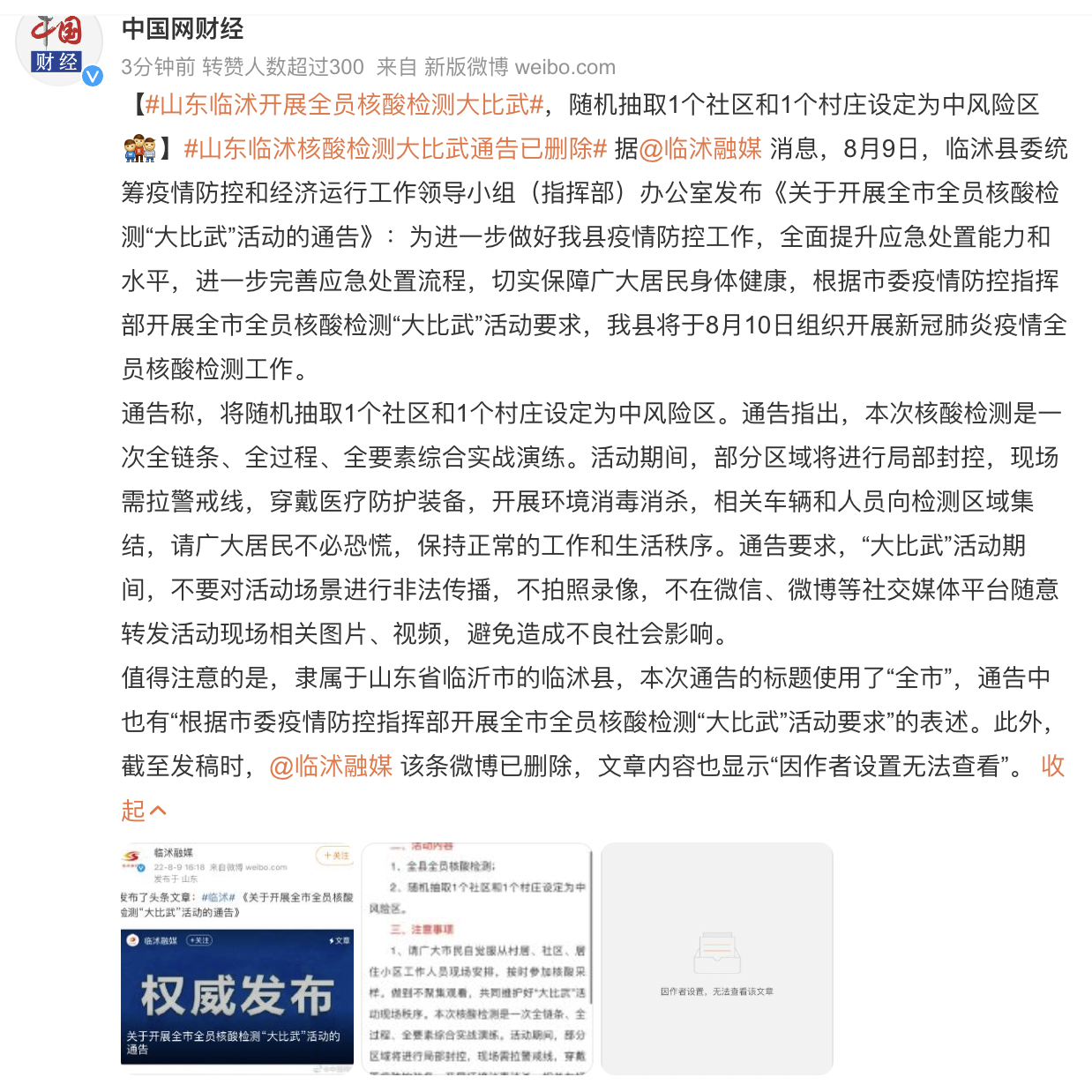 此外,截至发稿时,“临沭融媒”该条微博已删除,文章内容也显示“因作者设置无法查看”。
