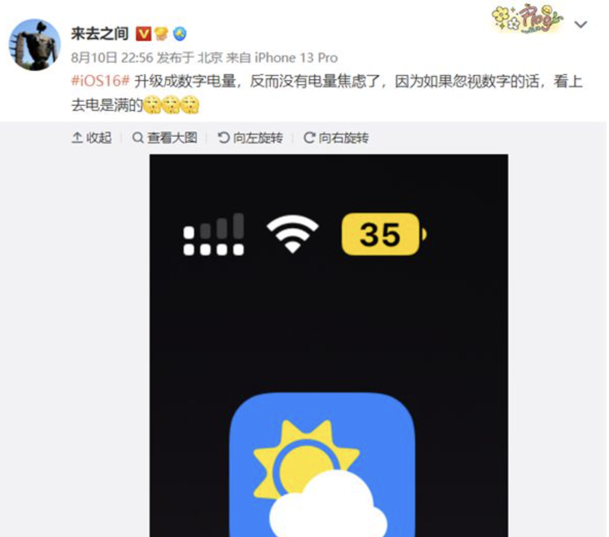 也有用户对于这个功能提出了吐槽。其中,微博CEO王高飞发文表示:“升级成数字电量,反而没有电量焦虑了,因为如果忽视数字的话,看上去电是满的”。