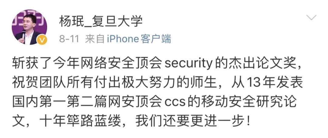 具体是复旦大学计算机科学技术学院杨珉教授领衔,系统与软件安全实验室发表的论文“Identity Confusion in WebView-based Mobile App-in-app Ecosystems”。