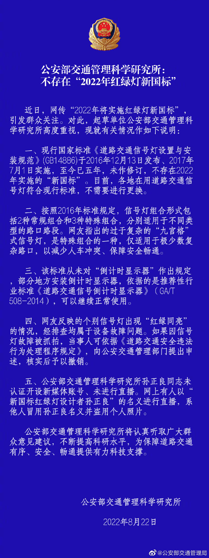 公安部交通管理科研所:不存在“2022年红绿灯新国标”。