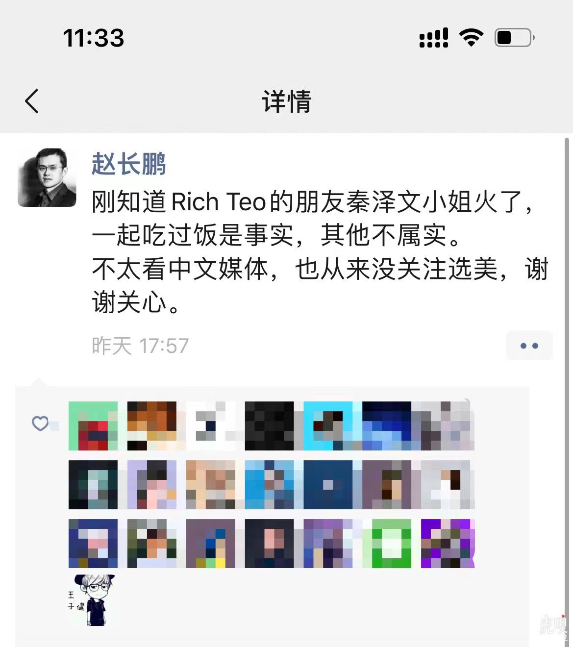 赵长鹏昨日回应称自己和秦泽文确实一起吃过饭,但除此之外其他传闻不属实。